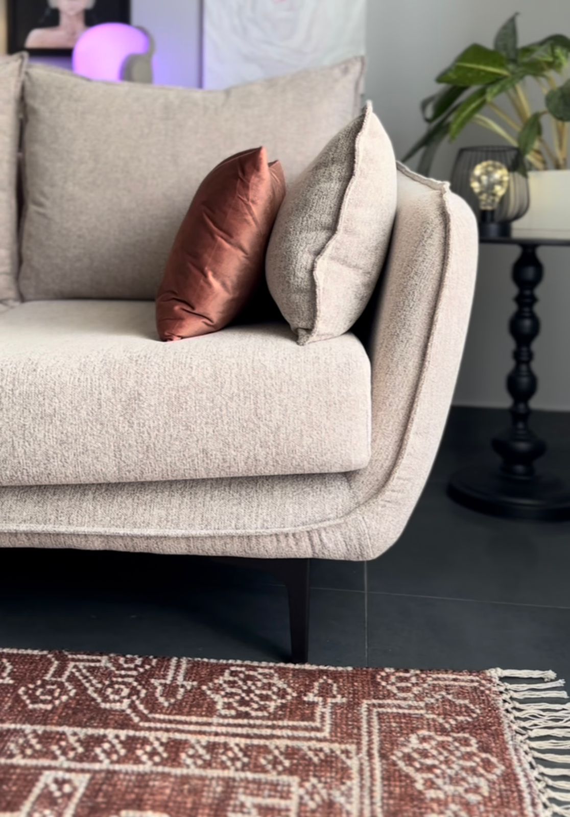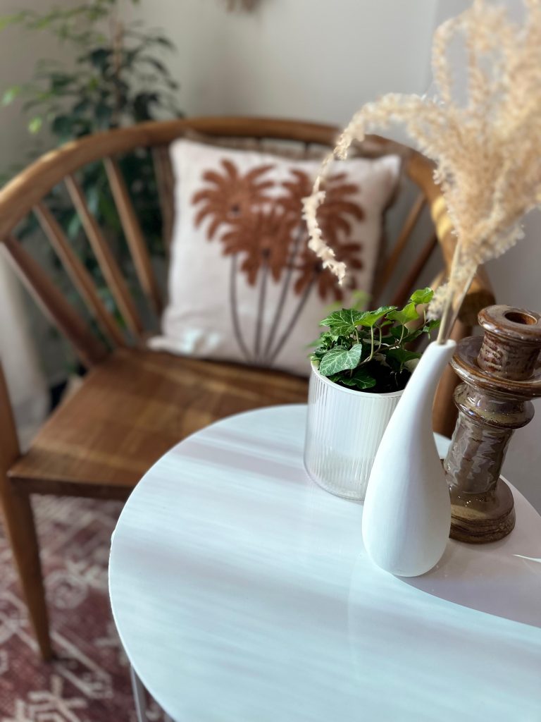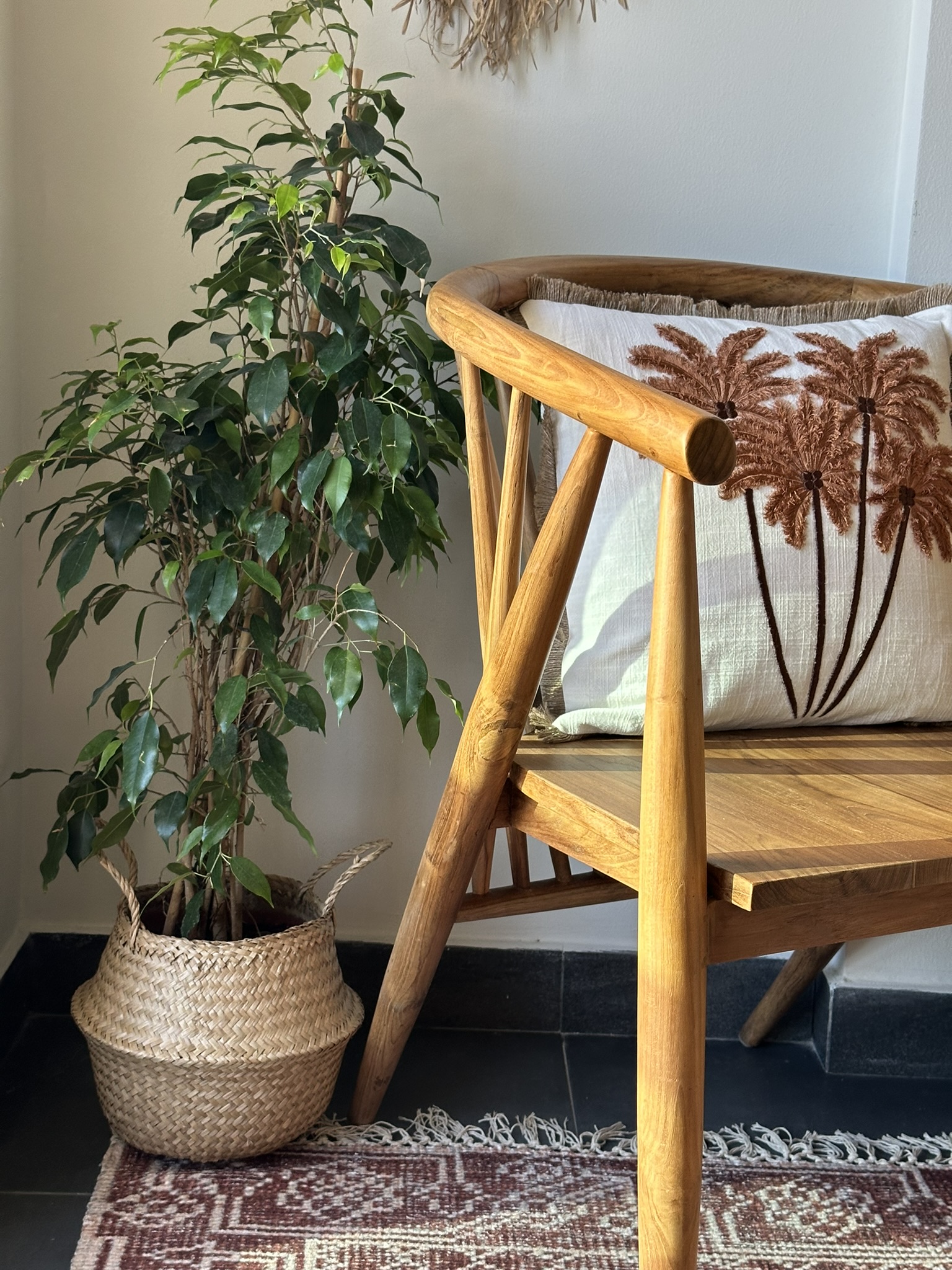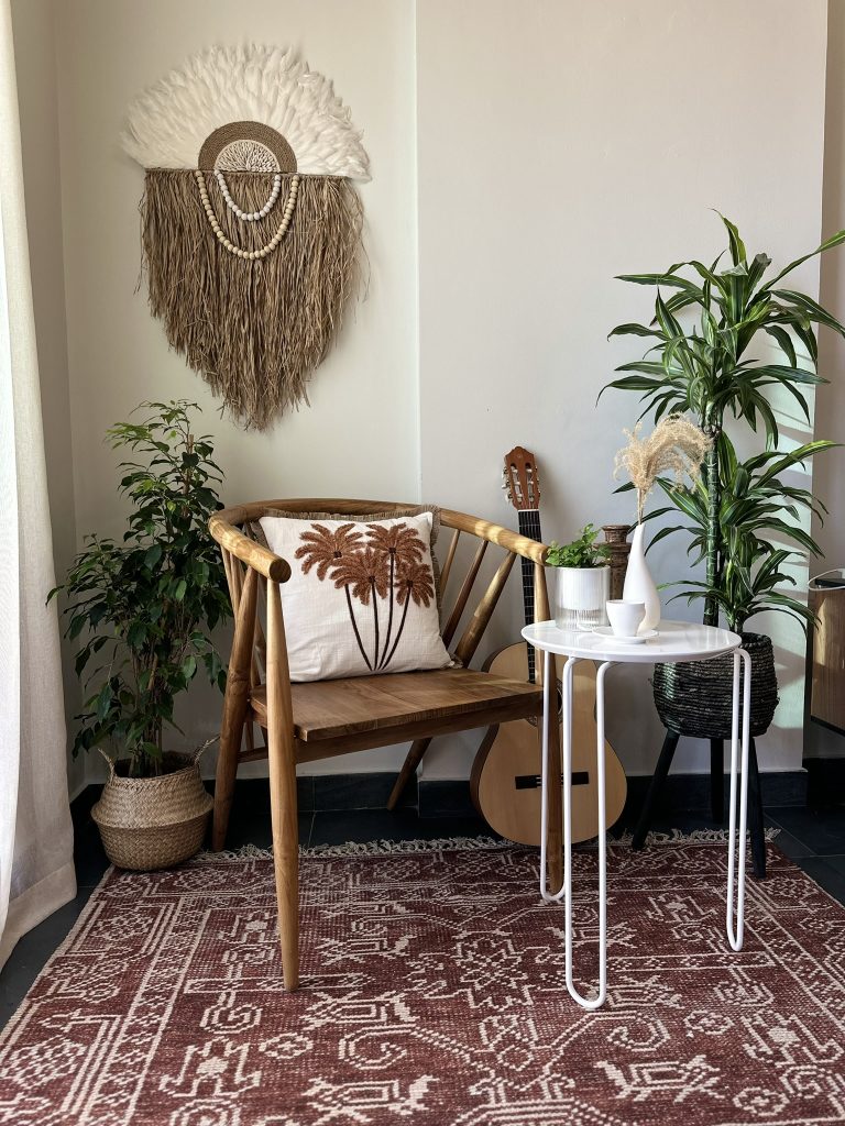 The focal point of the living room is a large, comfortable sofa adorned with an array of colorful, patterned cushions and throws, adding both visual interest and comfort. A rustic wooden armchair at the corner, surrounded by complementary side table and plants, fostering a relaxed and casual seating arrangement.